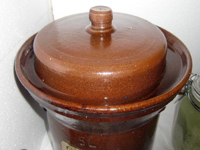 See the CO2 bubbles on the top? Going well. You can see the flat marble weight has shifted and isn’t staying down well. Lots of activity. No visible mold or yeast.