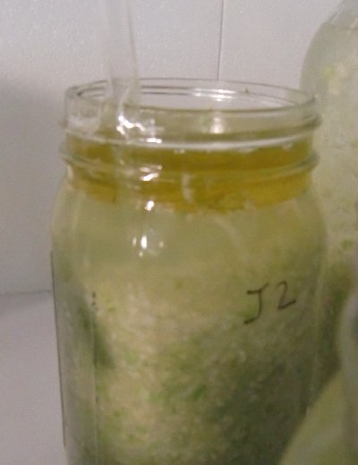 The CO2 has made its way to the top of the brine, which is nice and green. No visible mold or yeast.