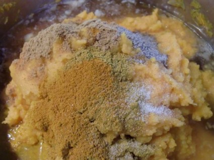 2. Heat 3 TBSP coconut oil in large soup pan over medium-high heat. When coconut oil has melted add 2 butternut squash (peeled and cubed), the grated apple, carrot, and onion mixture, and 1 cup apple cider. Heat until squash is tender, about 20 minutes. Mash with potato masher, and heat an additional 5-10 minutes until the butternut squash is completely tender.