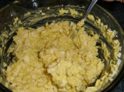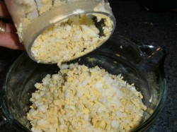 2. When all the eggs are chopped and in a bowl, add three egg yolks (this makes it Egg Egg Salad).