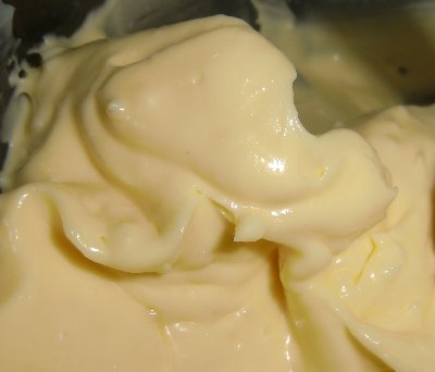 Well, I made it and have some questions…. Mine was BRIGHT yellow….looks like mustard is mixed in, but I have super yellow almost orange yolks. Also, after sitting in the fridge for a bit it is solid….which I guess it to be expected since palm shortening is solid when cold. Any idea to help soften it? Maybe half olive oil half shortening?