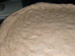 3. Then grease your hands with olive oil and scoop out the dough from the bowl where it was rising. The top will have dried out slightly, and you’ll want to flip that top side face down on the hot pizza stone (where it’s going to crust anyways). Spread out the dough, pushing from the middle out, and making the edges an inch or so higher than the center so the sauce and cheese don’t run off.