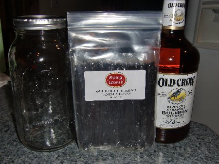 Then, you place the vanilla beans in your jar, top with bourbon (you can use vodka or rum), cap, and wait.