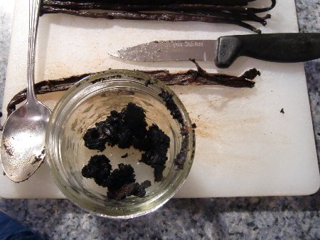 This step was time-consuming, but the rest was easy, so… What you have to do is take a paring knife and slice through one side of the bean so you can open it and scrape out the “seeds” with a spoon.When you buy vanilla paste, this is what you find in it, so the seeds aren’t bad. It just depends whether you like your vanilla extract very clear or not. I did my best, and it took about 25 minutes to slice and scrape.