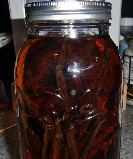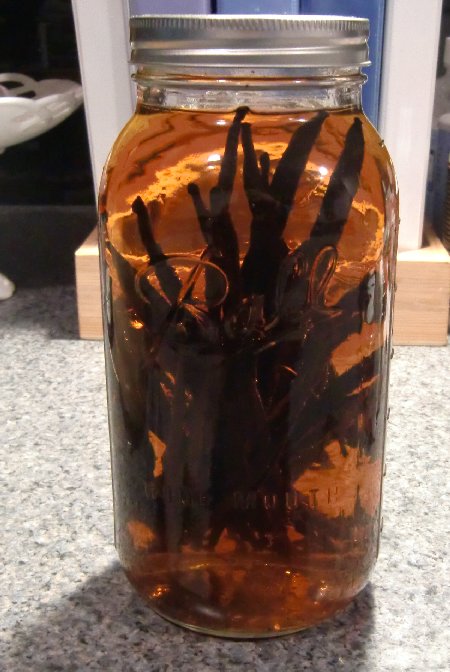 4. I also do this with vodka. I pour off a cup to use every few months and each time I add three beans sliced open and fill the bottle back up with vodka. It’s a continuous brew. I don’t remove the seeds either, just slice the bean and add it in. My vodka bottle is just about full of beans; I may just need a bigger liquor bottle!